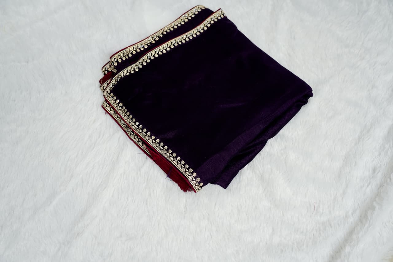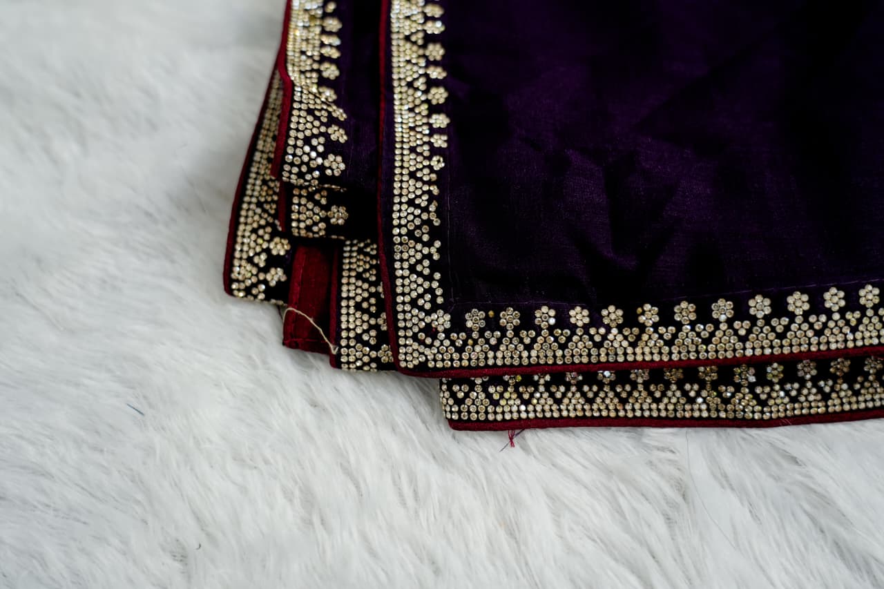 Turn heads with this luxurious designer saree in a deep wine purple shade, exuding pure elegance and royal charm. The saree features a smooth, rich finish enhanced with a striking contrast border in deep maroon, beautifully embellished with intricate stone and bead detailing. The finely crafted border adds a glamorous sparkle, making it perfect for statement occasions.