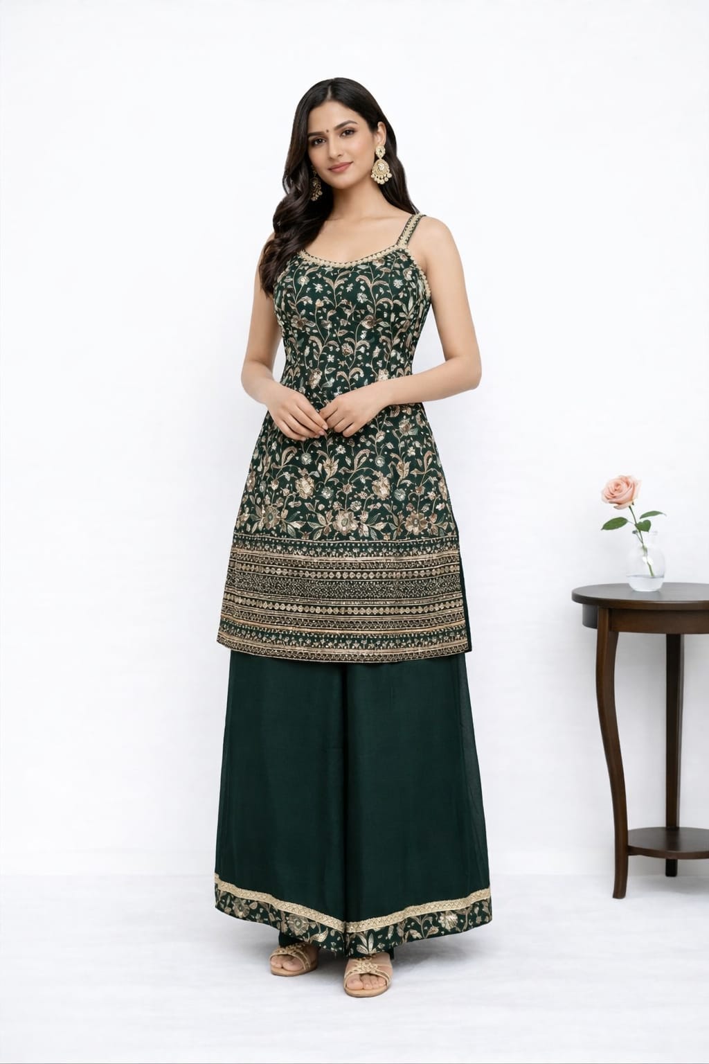 🔸 Design: Sleeveless embroidered kurta paired with flowy palazzo pants