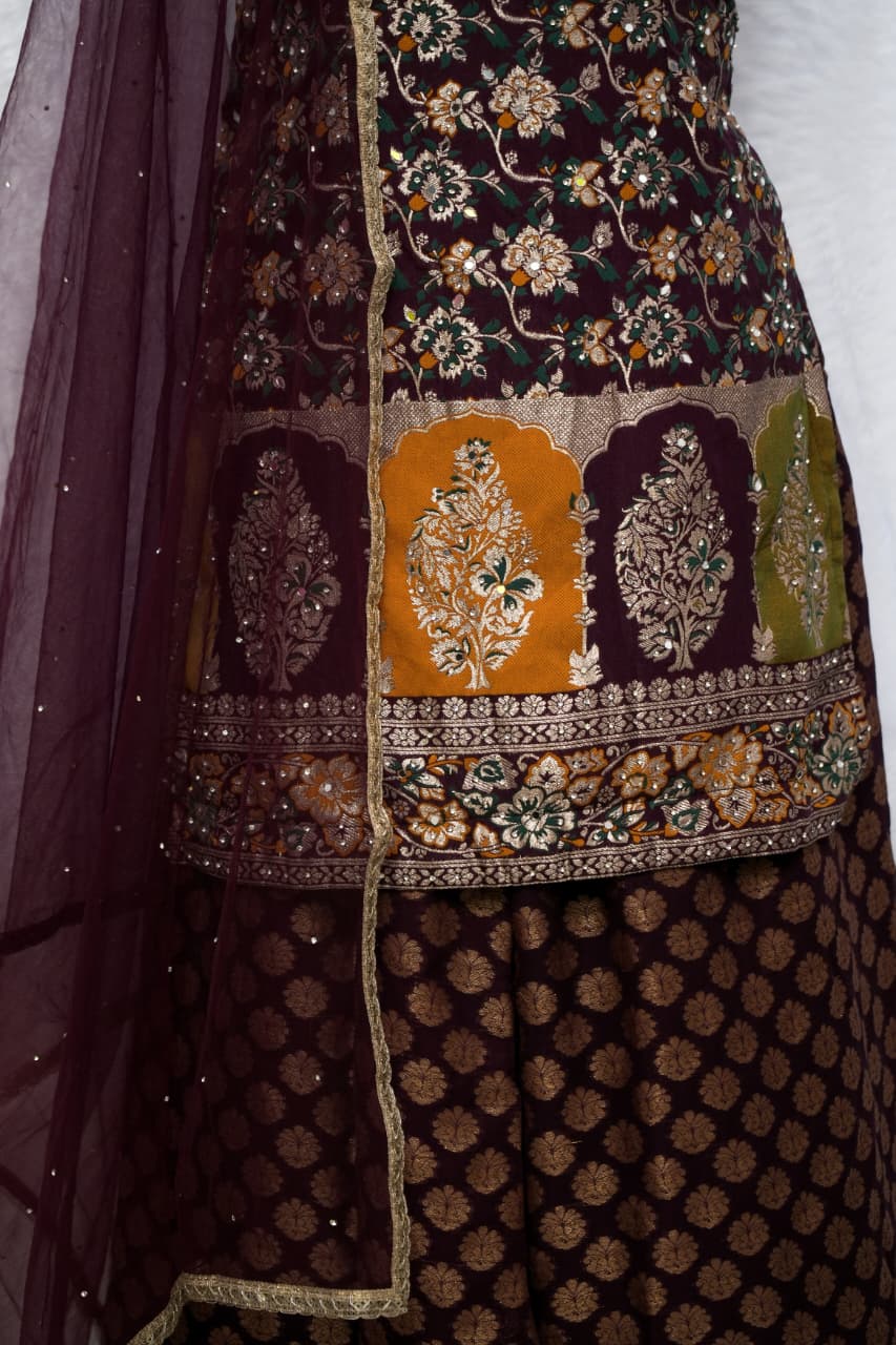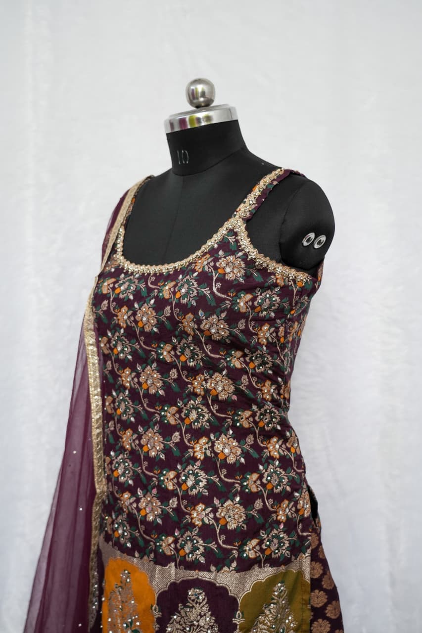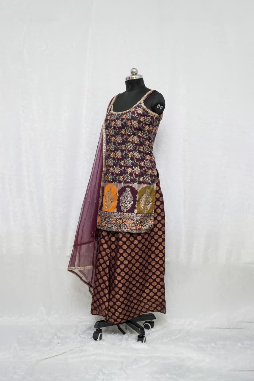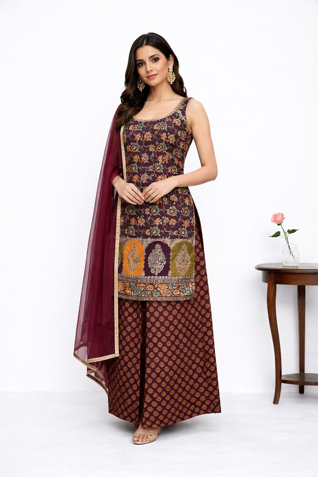 Upgrade your ethnic wardrobe with this stunning maroon palazzo set, designed with rich floral motifs and a graceful silhouette. Crafted in a blend of georgette and silk, it offers both elegance and comfort.
