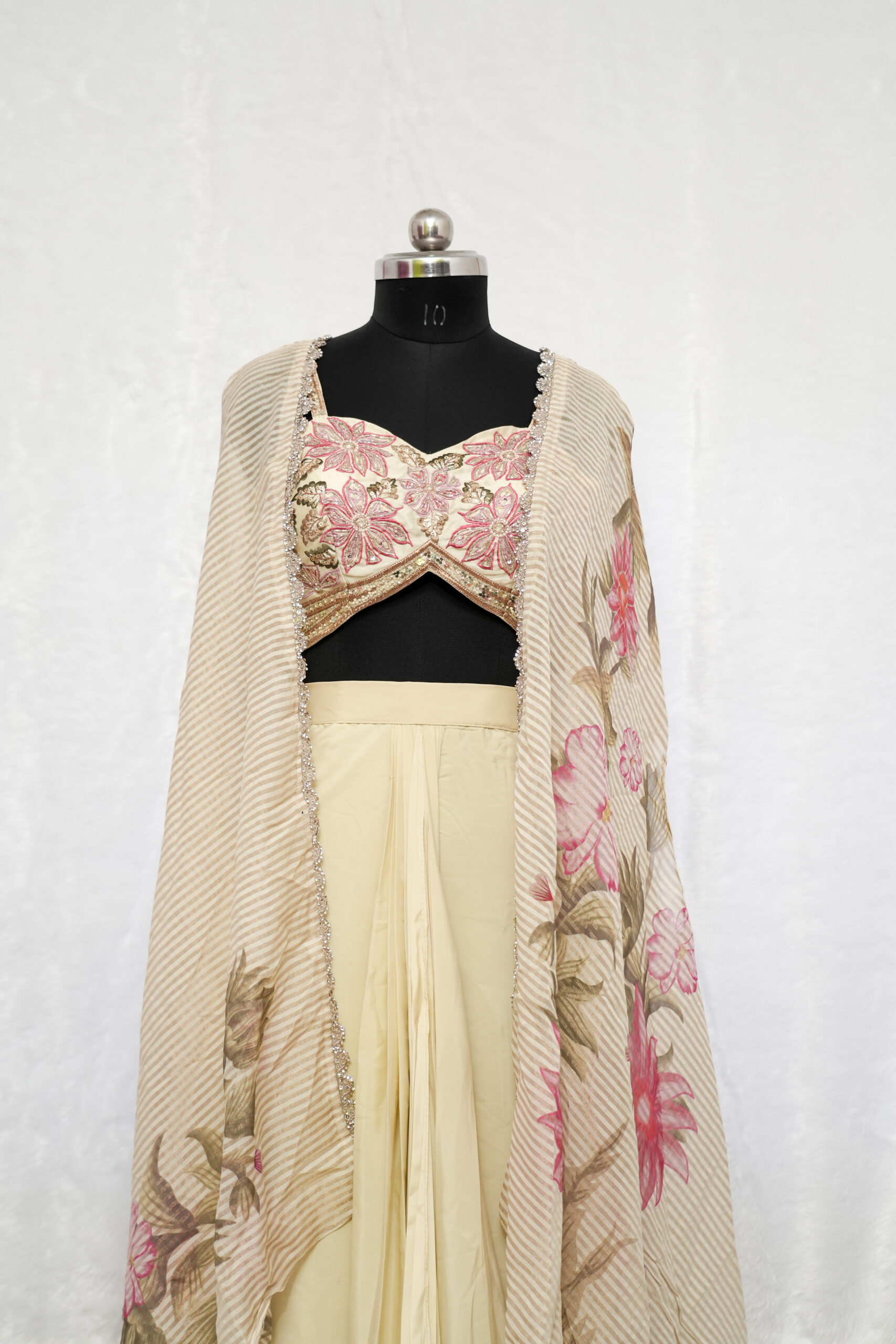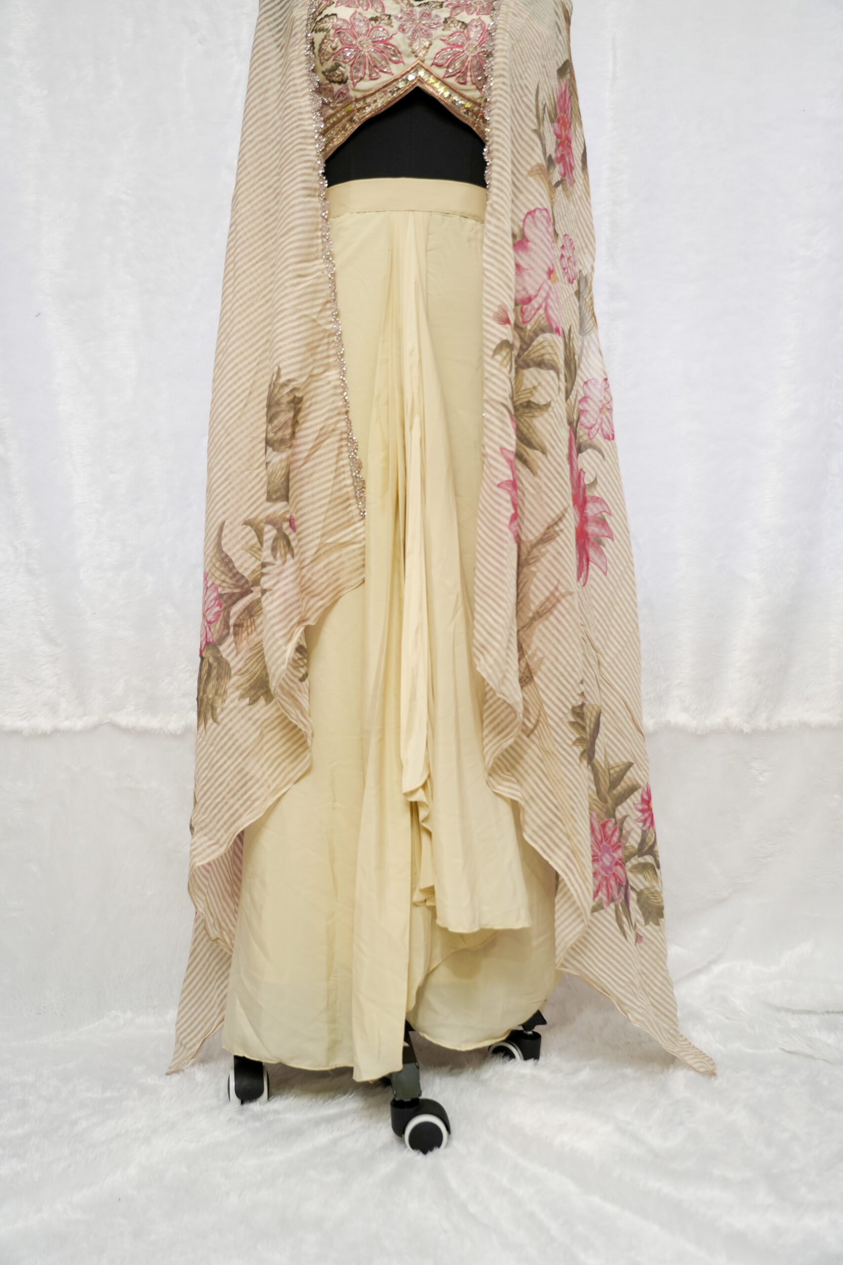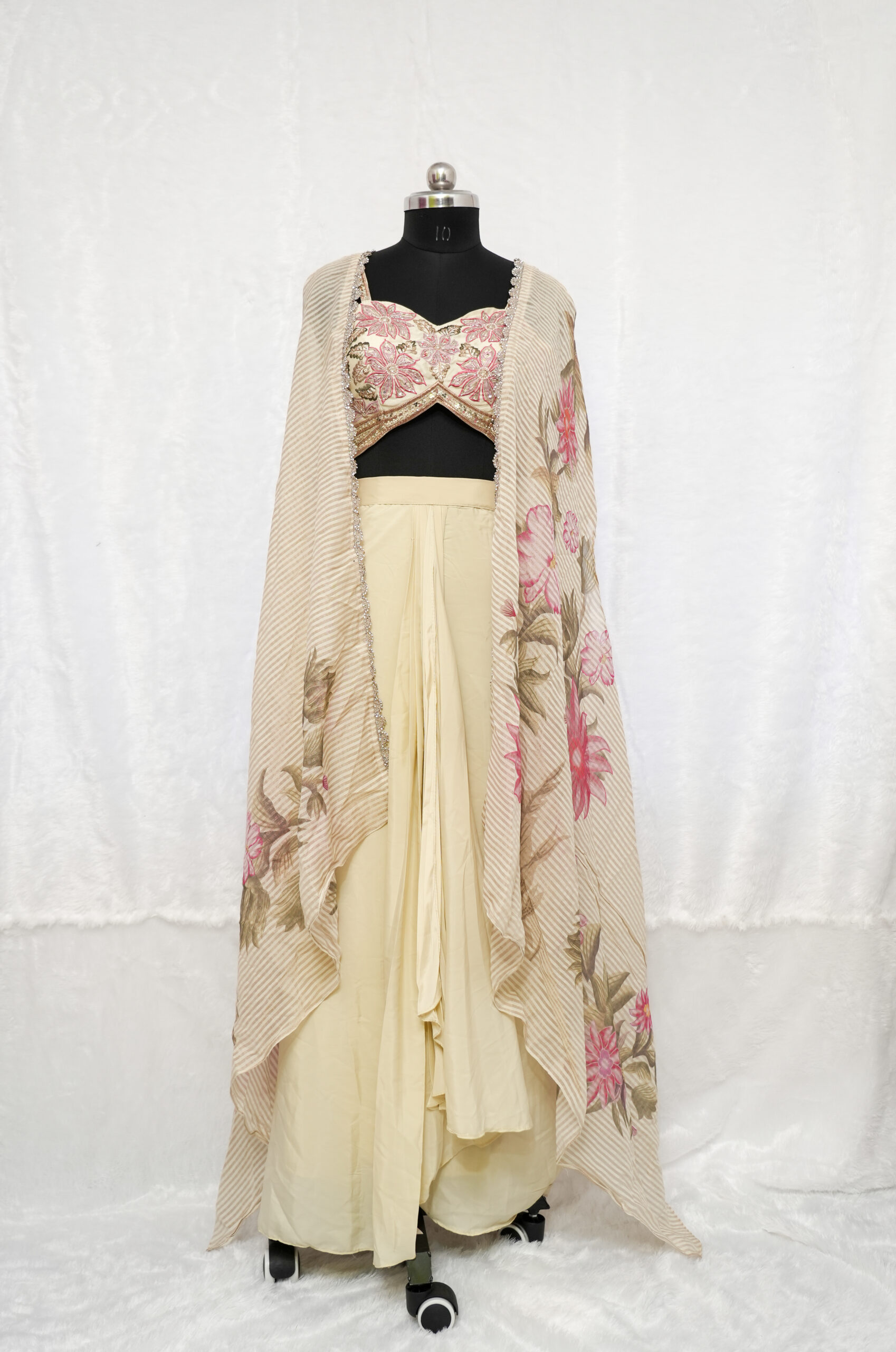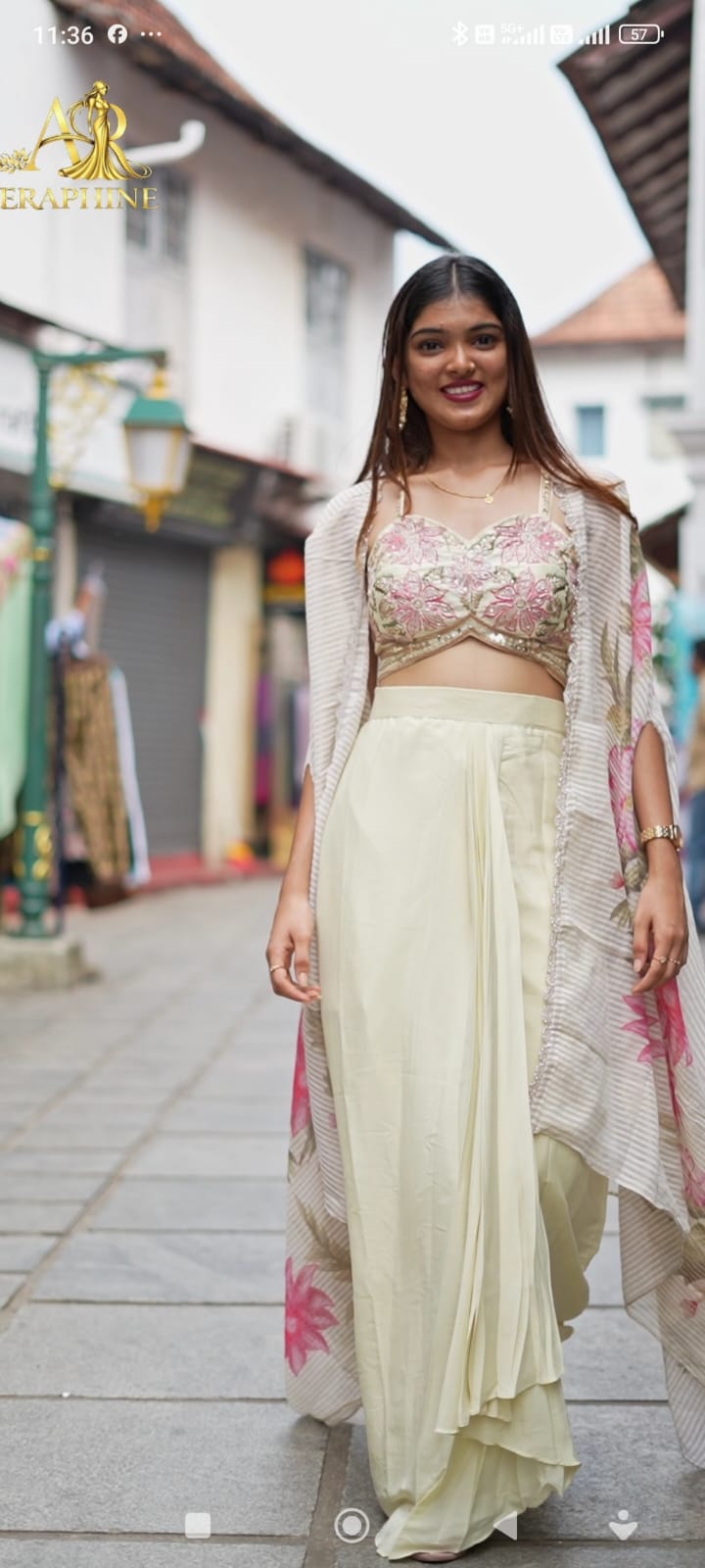 Step into effortless elegance with this stunning white shrug dhoti set. Designed with soft tones and delicate detailing, this outfit gives a perfect blend of grace and modern style.