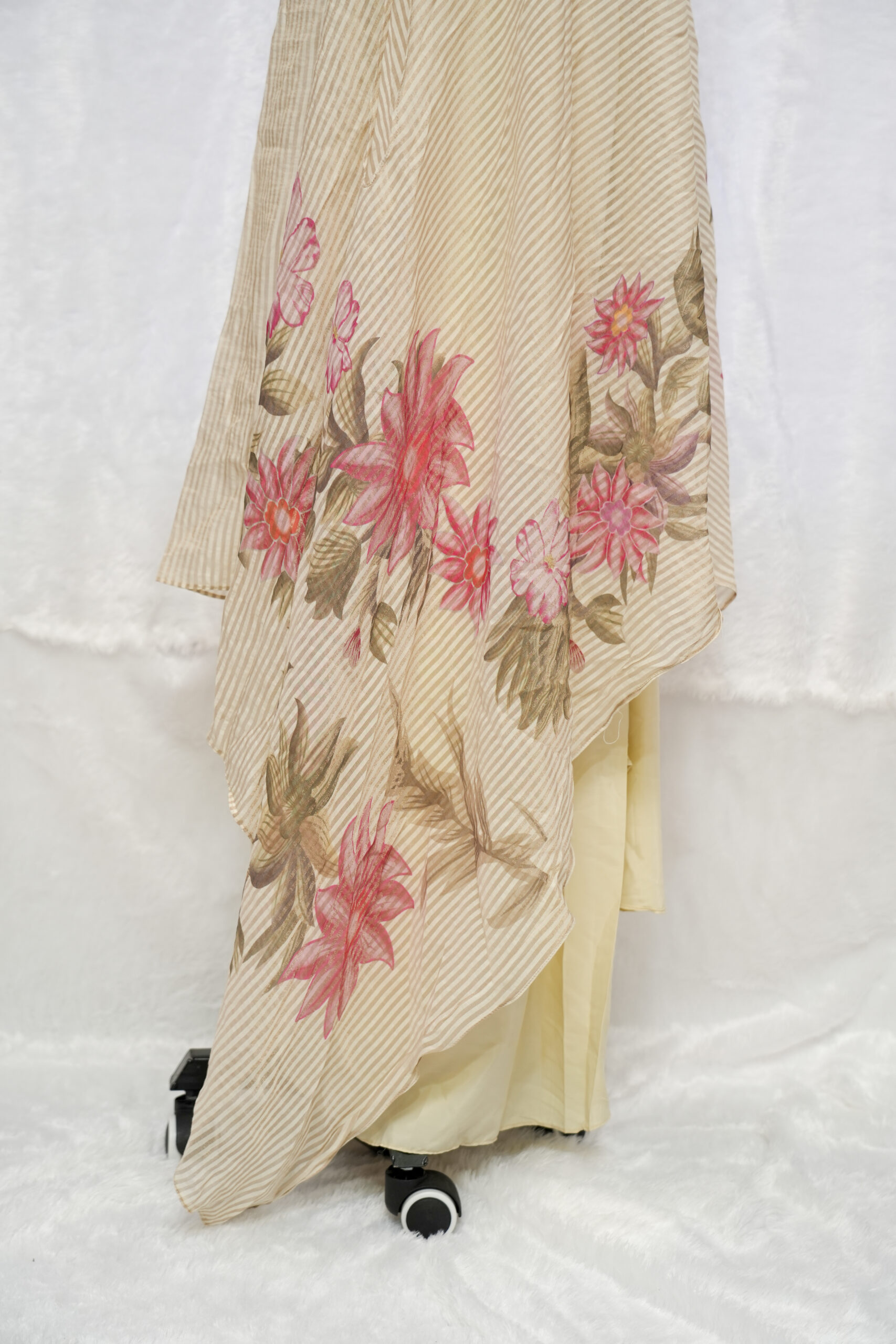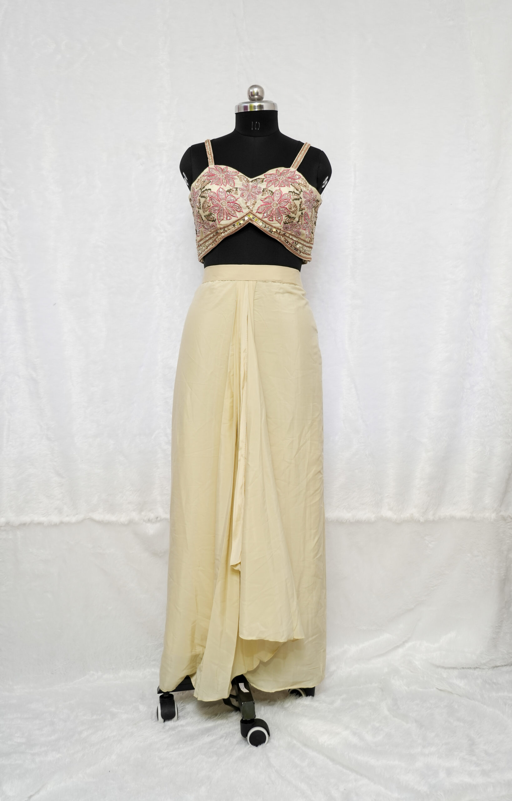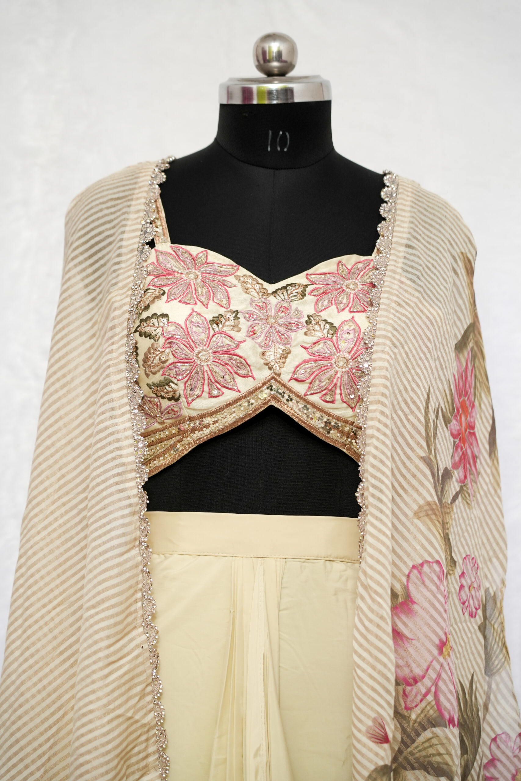 Step into effortless elegance with this stunning white shrug dhoti set. Designed with soft tones and delicate detailing, this outfit gives a perfect blend of grace and modern style.