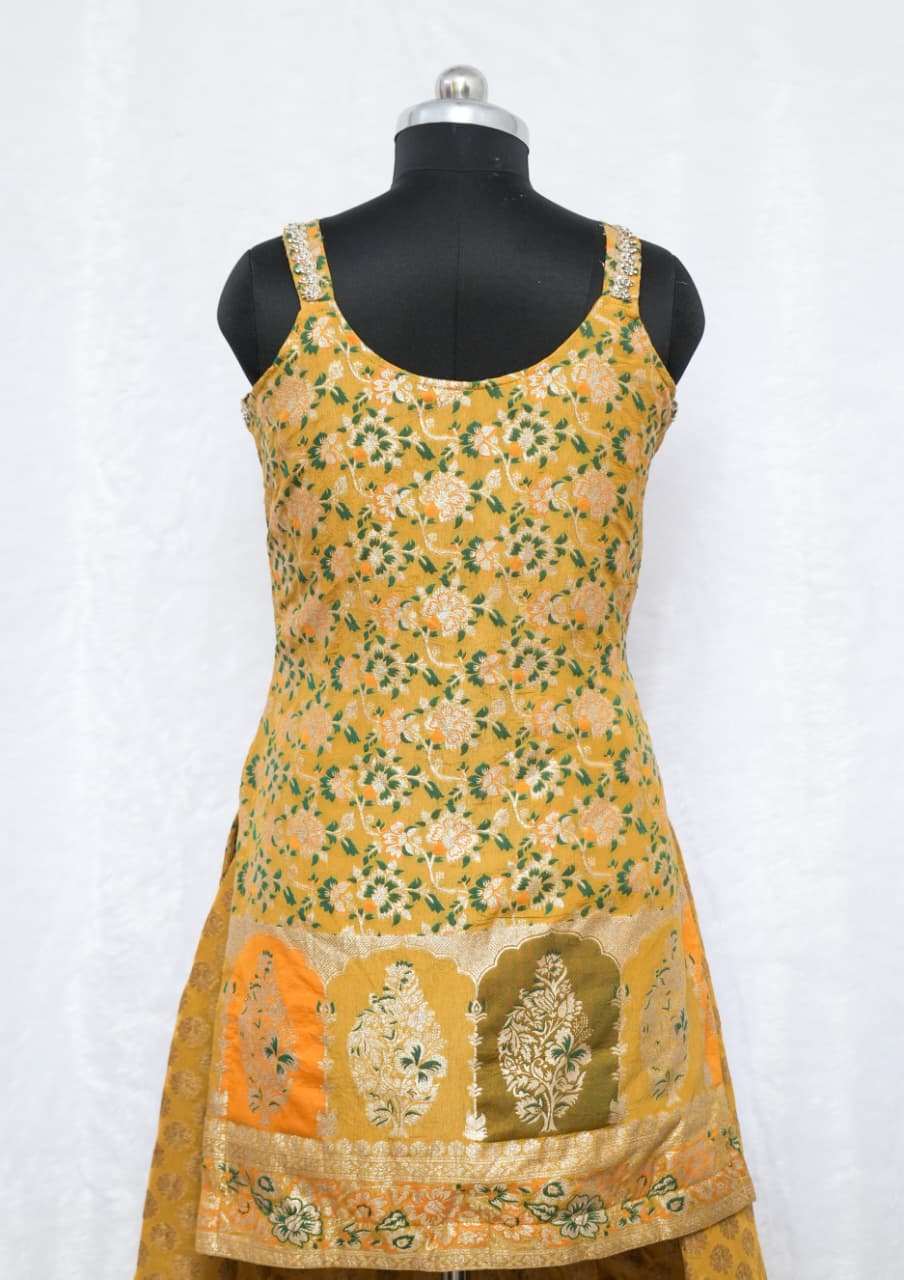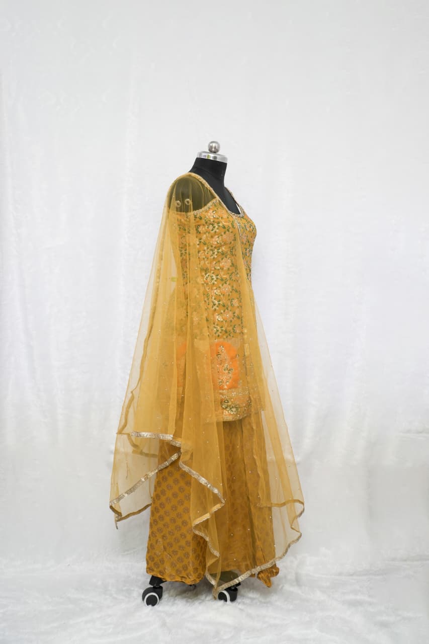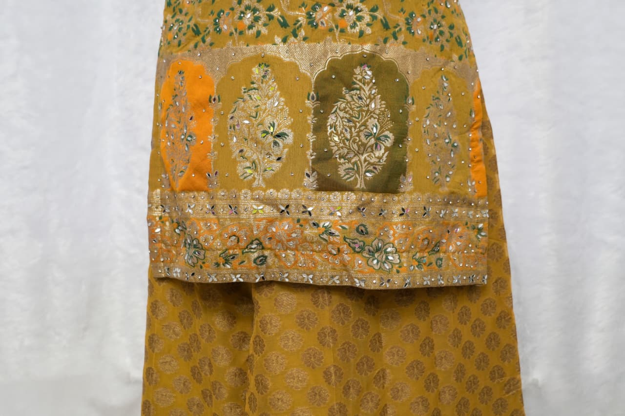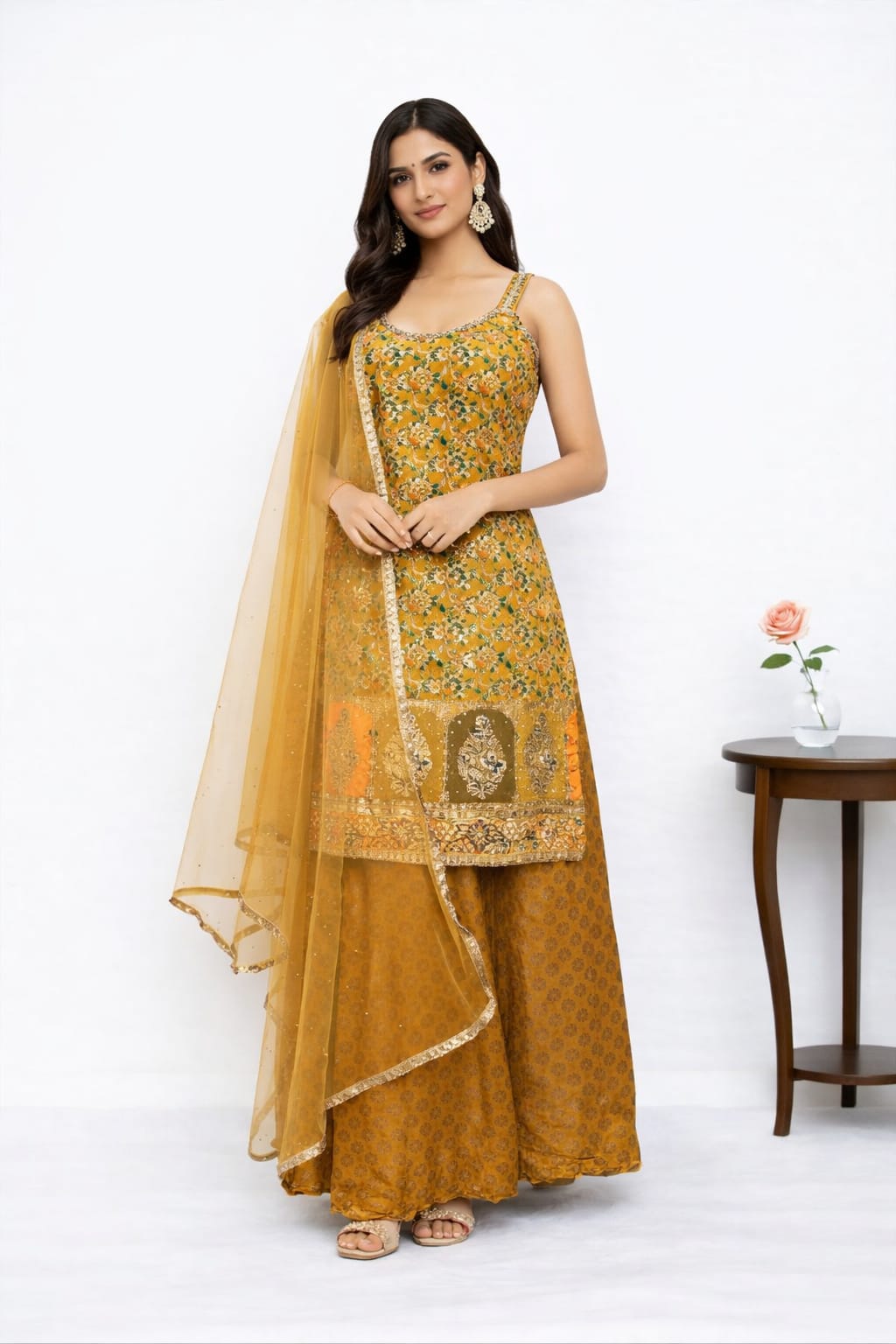 🔸 Color: Mustard Yellow with intricate floral embroidery