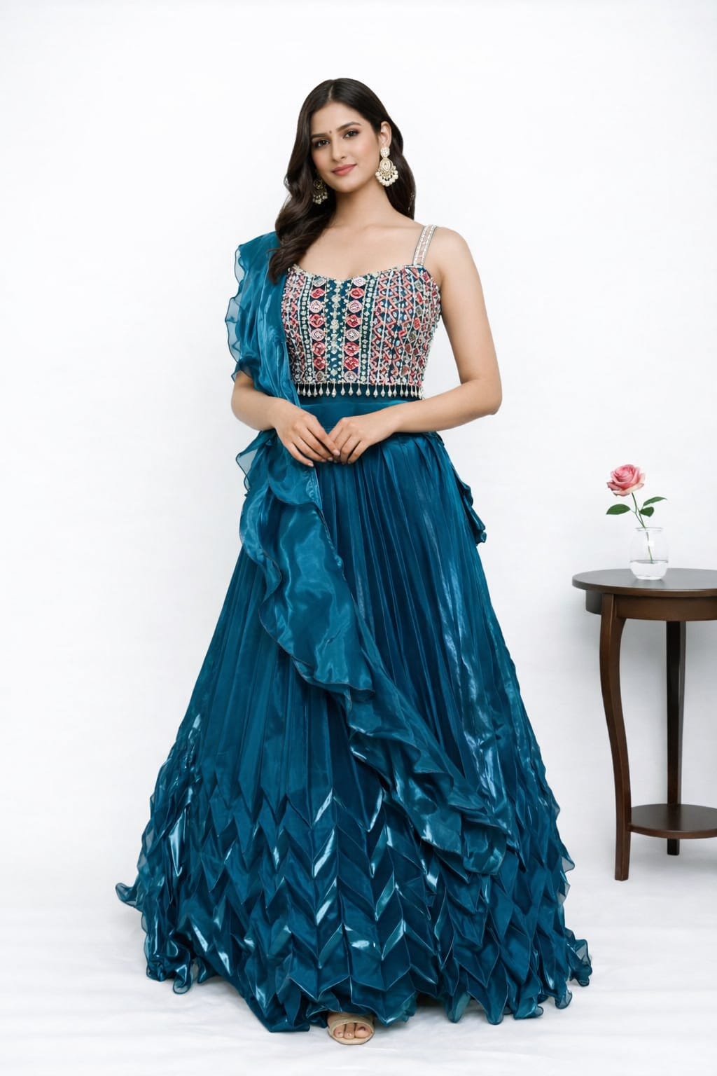 Make a statement with this stunning lehenga set in a rich peacock teal shade, designed with a modern silhouette and intricate detailing for a luxurious festive look.