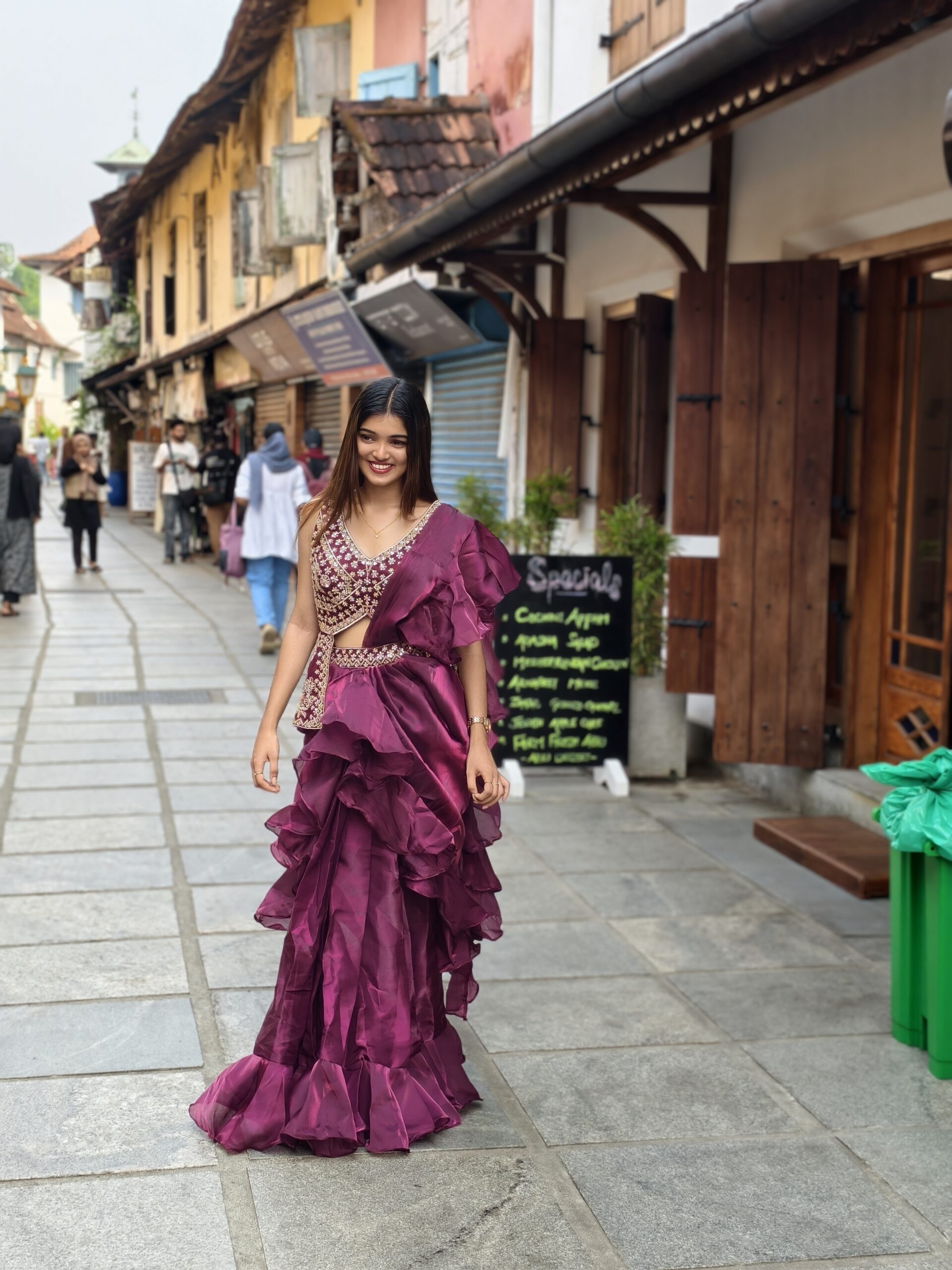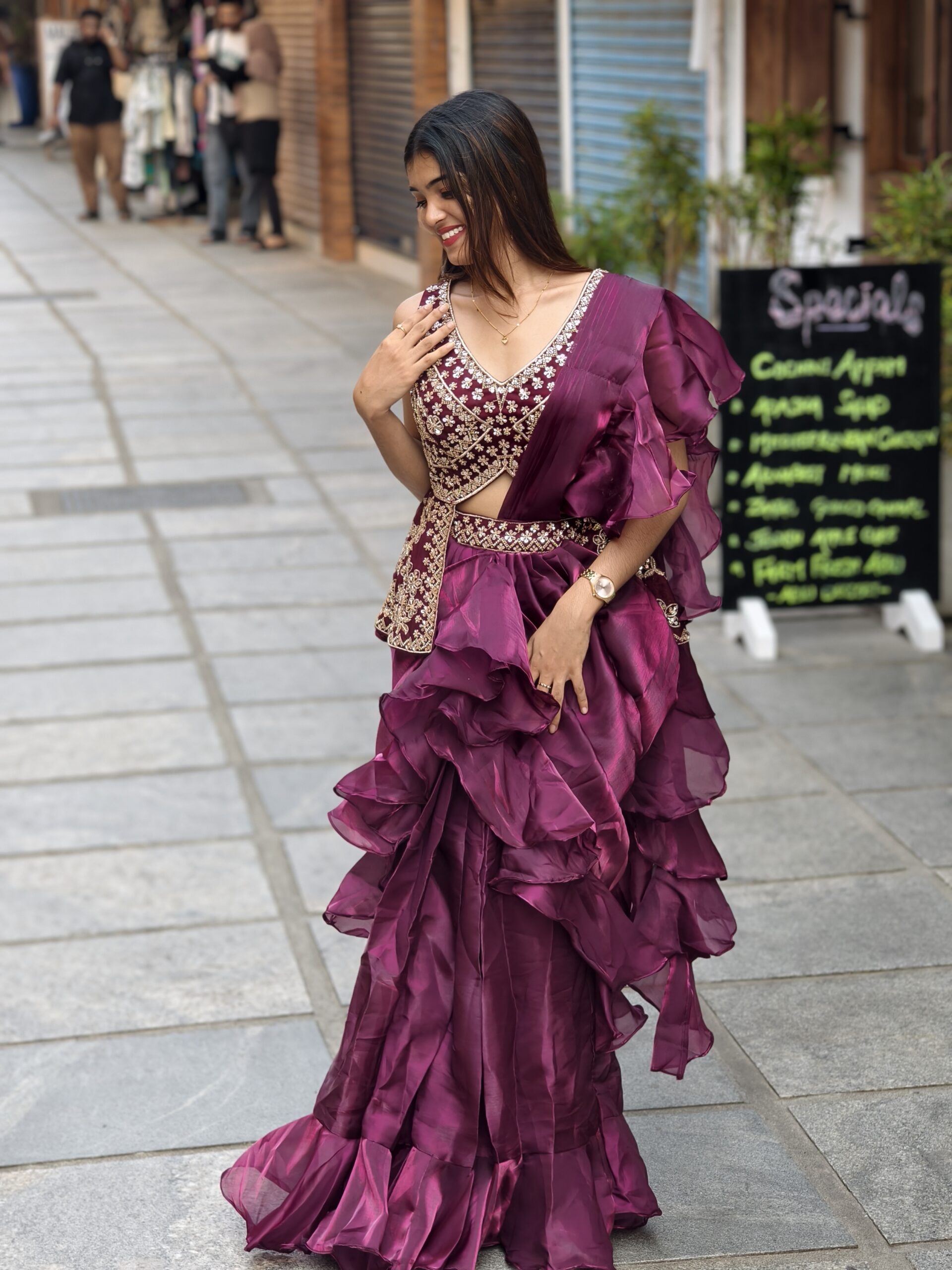 - 🔸 Design: Heavily embroidered sleeveless blouse paired with a layered ruffle dhoti and matching drape
