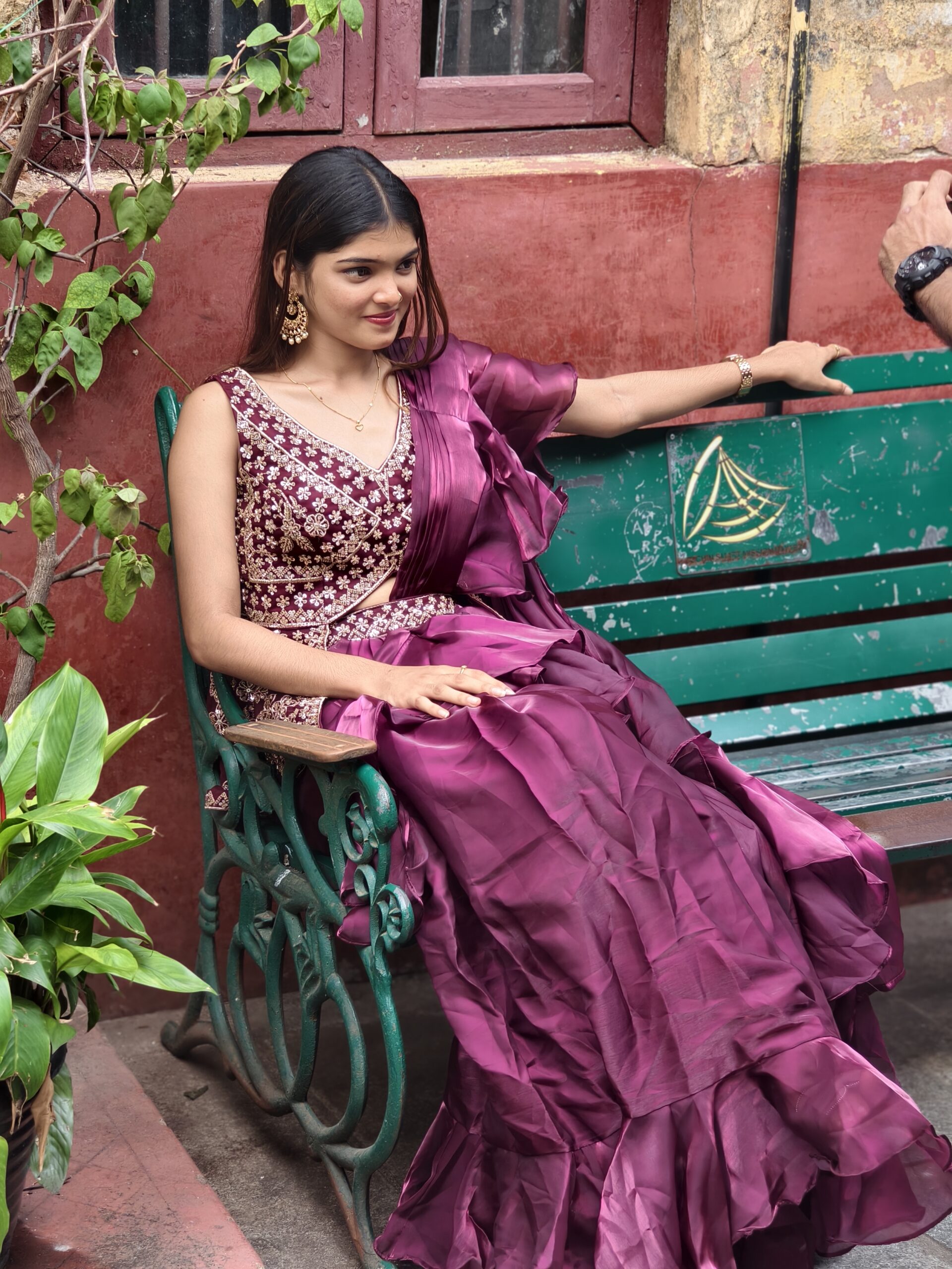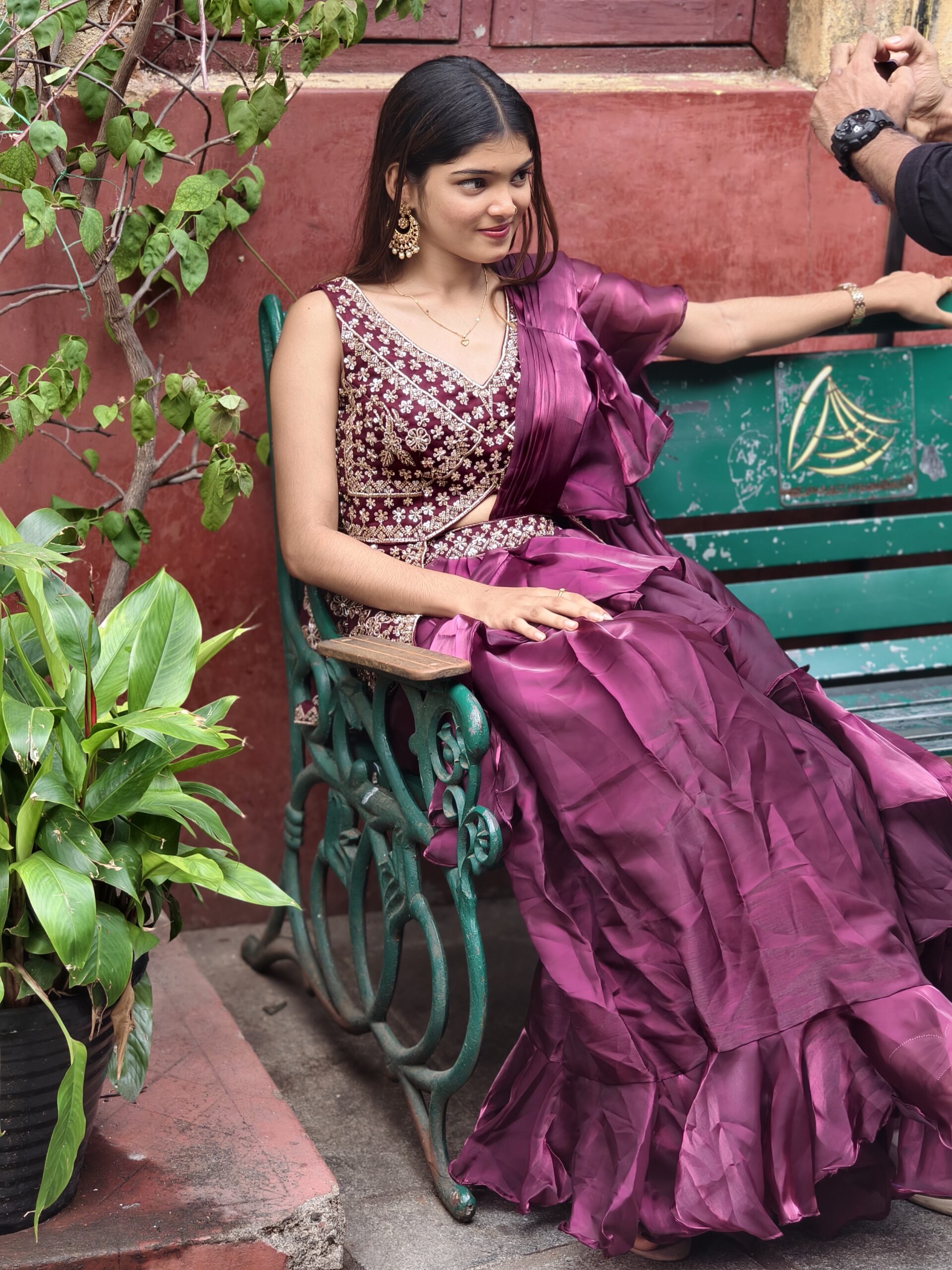 Make a bold fashion statement with this stunning wine ruffle dhoti set. Designed with intricate embroidery and dramatic layered ruffles, this outfit is the perfect blend of elegance and modern glamour.