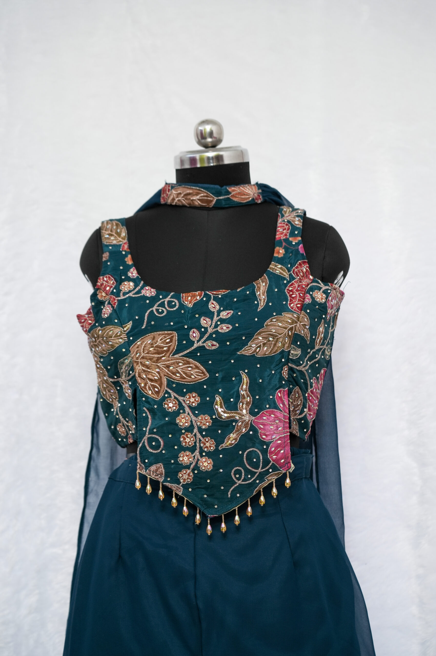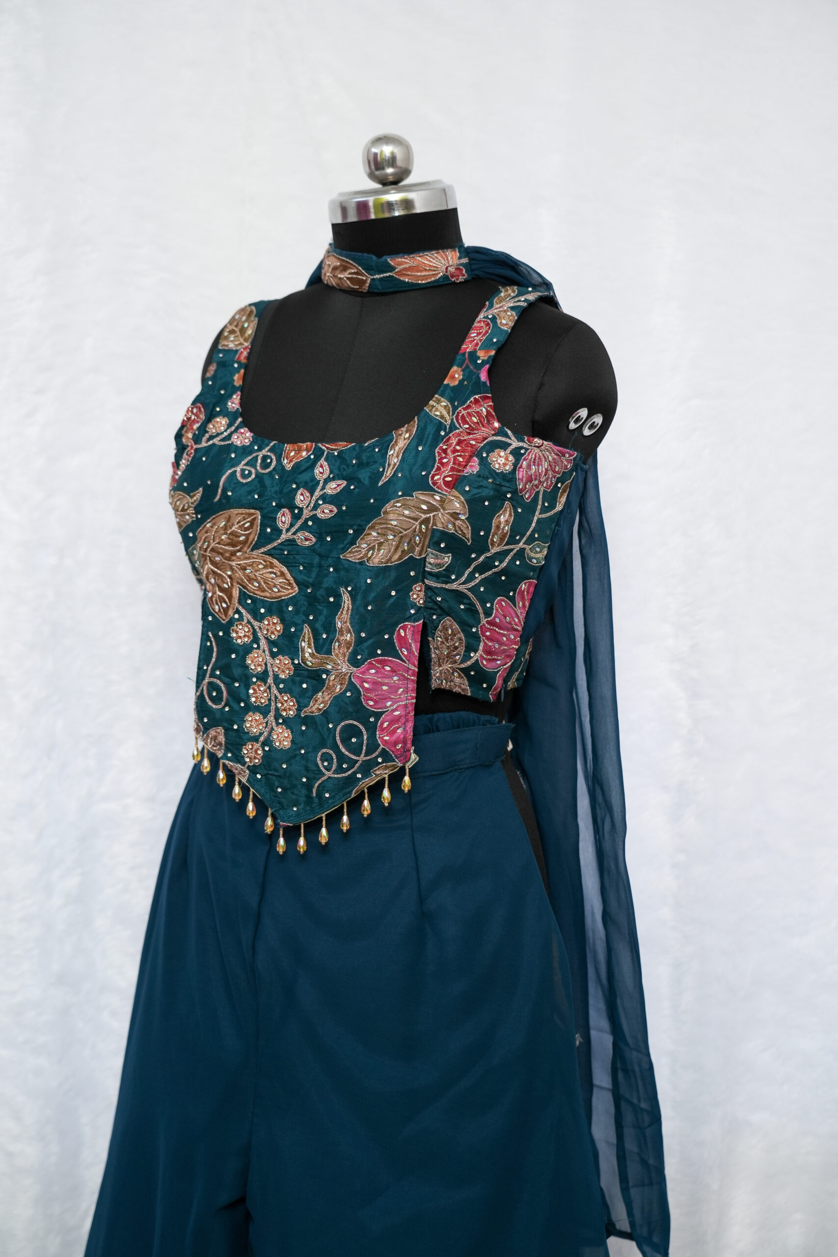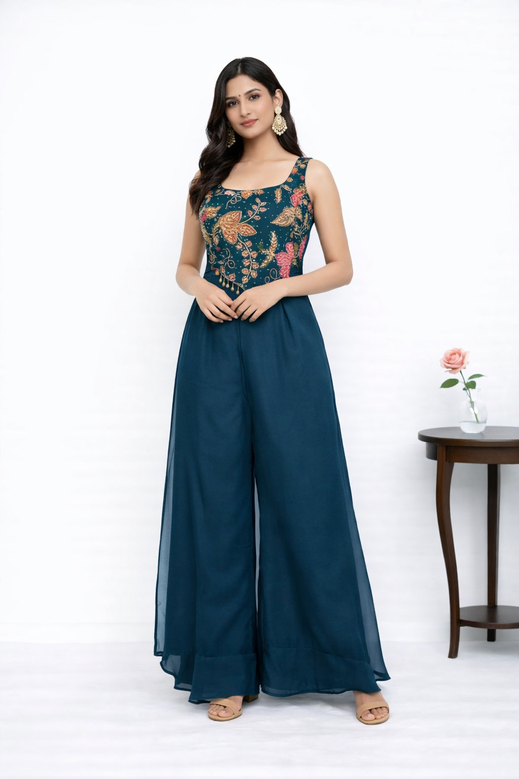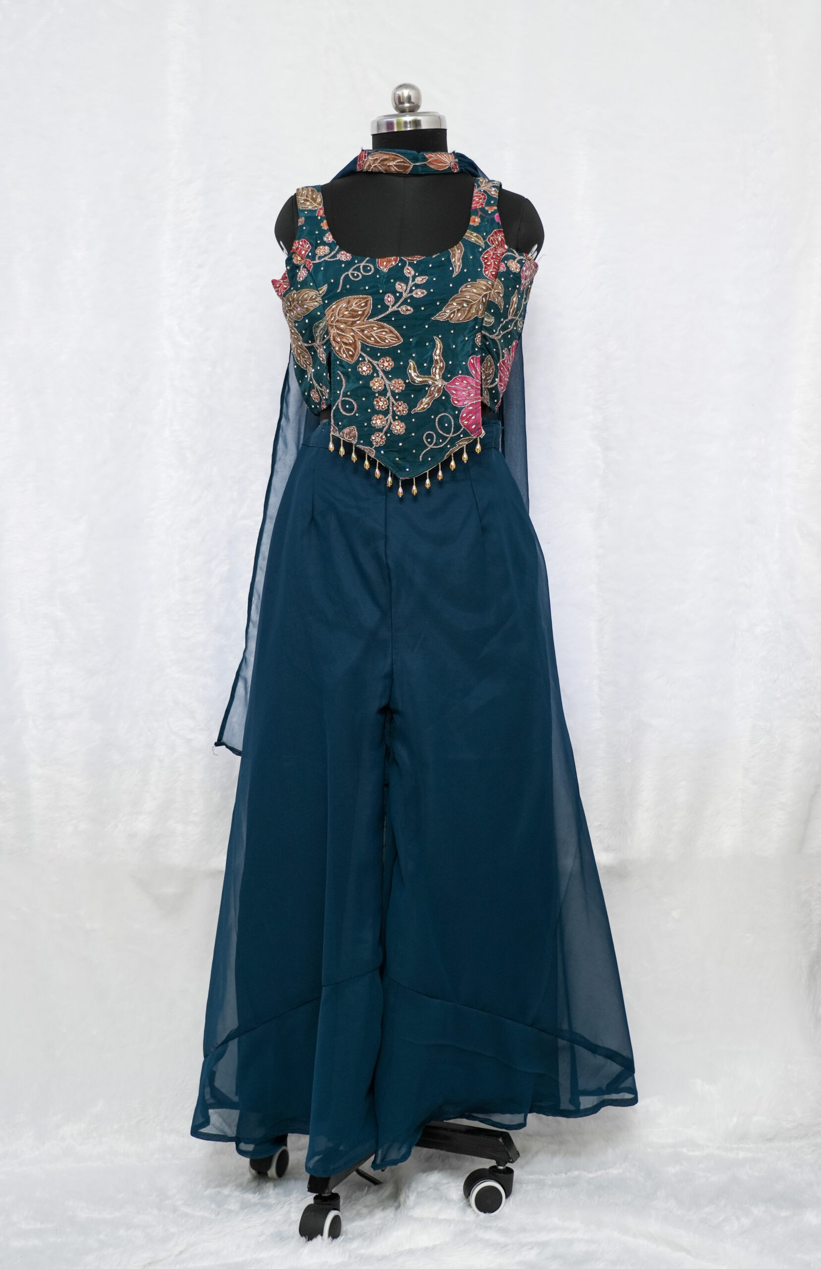 Upgrade your ethnic style with this beautifully designed teal divider set. With its modern silhouette and flowy finish, this outfit is perfect for a chic and graceful look.
